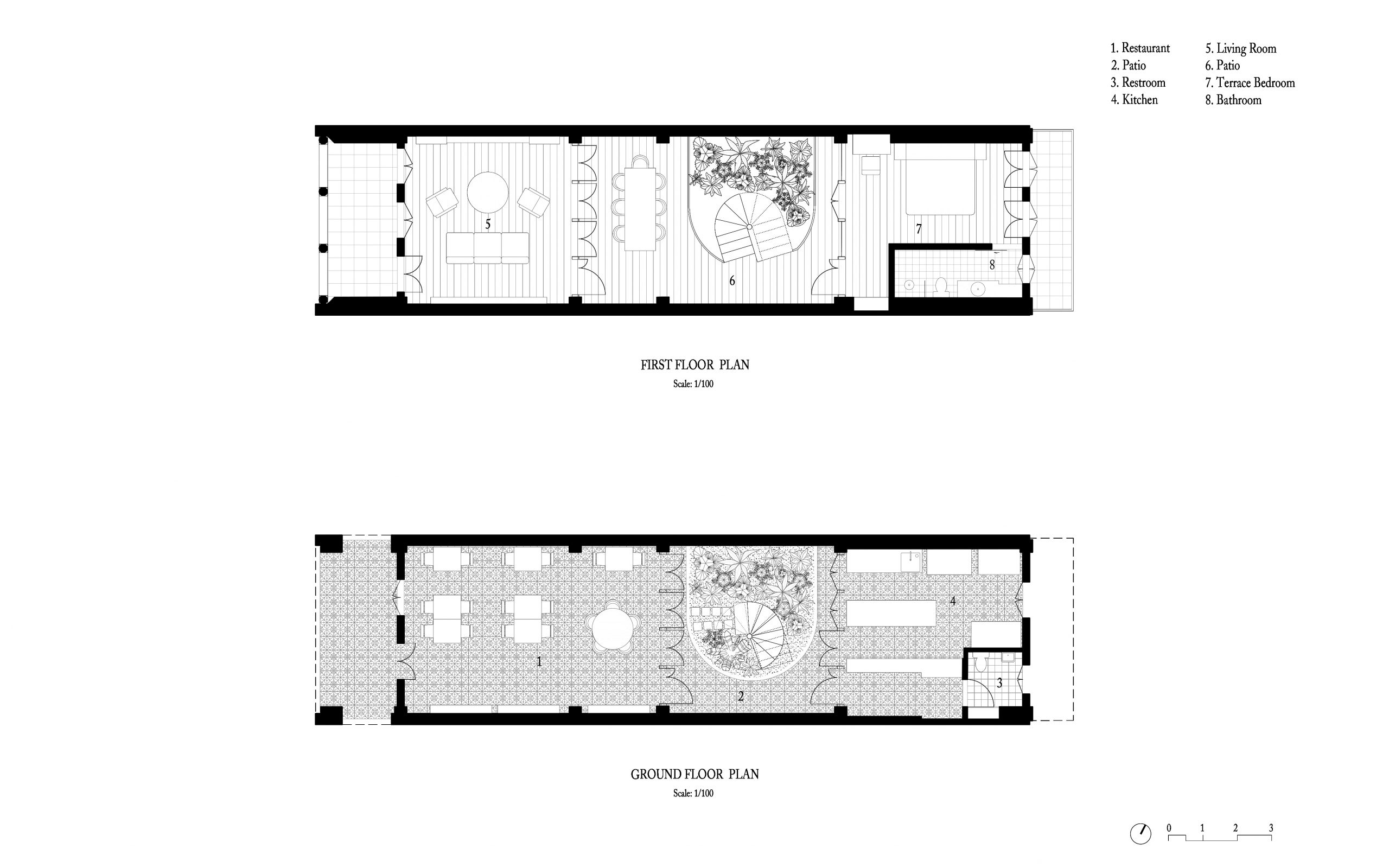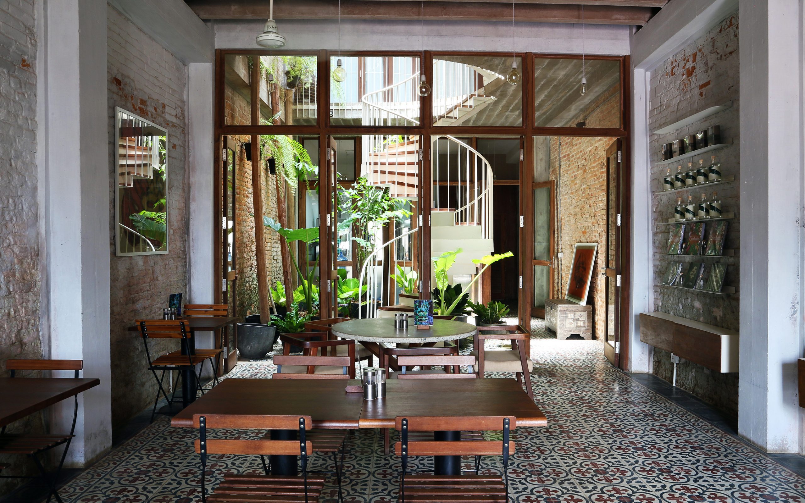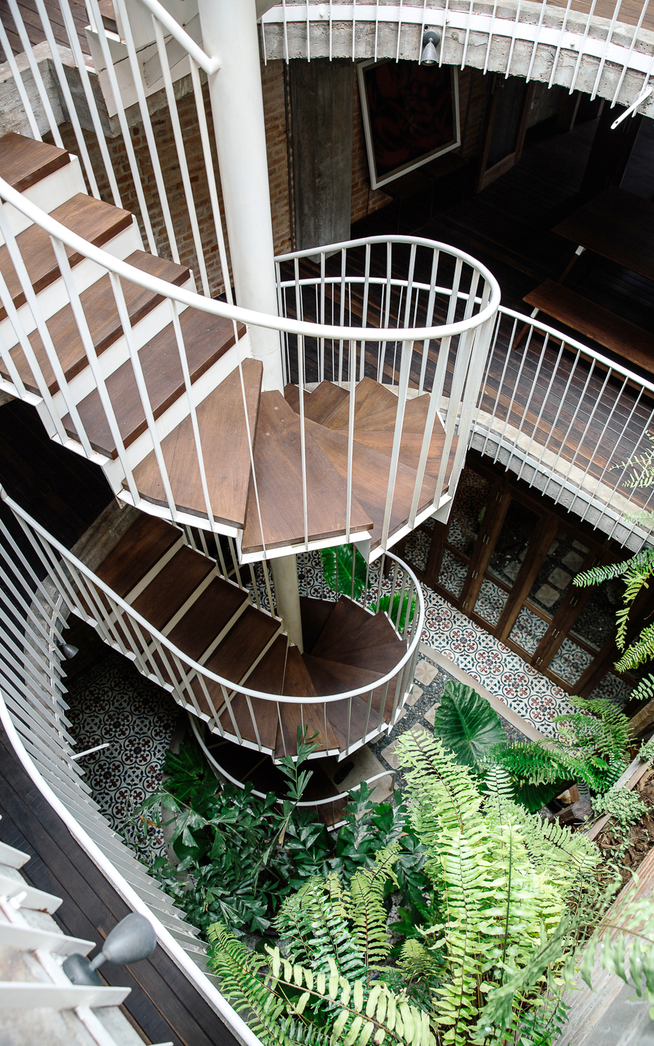 Taking everything into account, the interior is impressive and well-lit thanks to a center courtyard with a steel spiral staircase giving access to the family home upstairs. As the most important feature of the house, it brings in natural daylight and increases ventilation, keeping the house cool in summer.